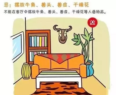 客厅中不宜摆放牛角、兽头、兽皮、干燥花等人造物品。牛角、兽头、兽皮、干燥花等都是原本具有生命,但历经死亡过程后产生的物品,放在活人的生活空间不是件好事。尤其是牛角、兽头,会对家人事业造成伤害。甚至会影响家庭的财运。