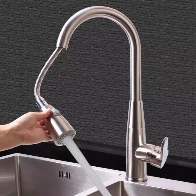 现在大多厨房的水龙头都更新成抽拉式的,可以全方位清洗水槽里的锅碗瓢盆,而且溅出的水渍也变少了。