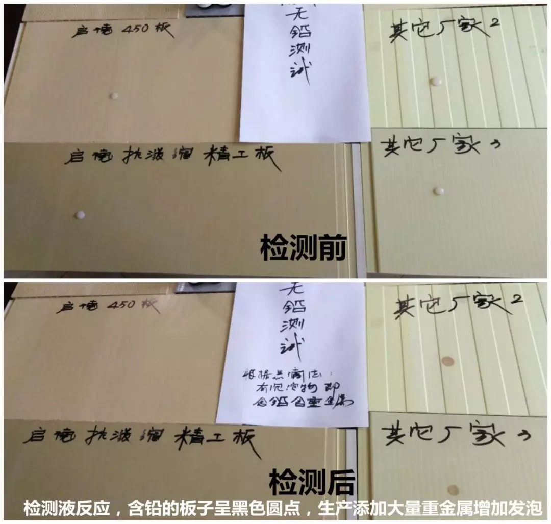 2. 板子厚度:切记,板子厚度和密度要成正比才是好板子,很多小厂为了增加板材厚度,往原料里加了铅盐增加板子发泡度,这样的板子,一个房间要使用三公斤铅盐,可溶性铅溶于水,会和潮湿墙体中物质反应形成有害挥发物,造成铅中毒。这样的板子,其实很好分辨,表面看板子非常厚实,但手指一按,板子就会塌下去一个坑,板材是因为发泡过头造成板材密度疏松。如果板子壁厚不厚,但是截面看起来密度高,表面硬度大,也不代表就不是好板子。检测板材含不含铅,也不难,拿一滴硫化钠和一滴醋酸滴在板材表面,两分钟后板面发黑说明板子含铅,因为醋酸和硫化钠会和材料里面的铅合成黑色硫化铅,黑色越深,板材含铅越多,慎选。反之,如果没有变黑,说明板材不含铅,无法发生反应生产硫化铅。(实验原料硫化钠有毒性,请务擅自使用)