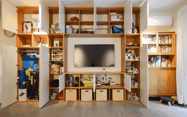 客厅是我们日常生活中使用是最为频繁的区域,集聚放松、游戏、娱乐、部分工作以及学习功能于一体。而客厅最常见的收纳空间基本集中在电视墙和茶几两个部分,茶几的收纳力度不会太大,如果客厅杂物过多的话,推荐使用电视墙收纳空间▼