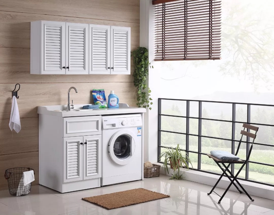 阳台的收纳一般是存放绿植、洗衣机、杂物、洗衣液、搞卫生的道具等;