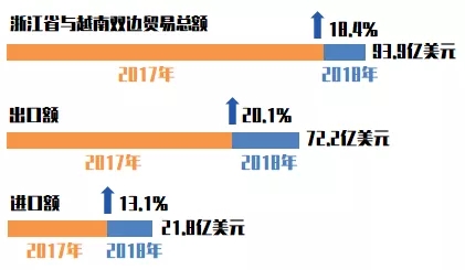 越南是中国浙江省在东盟的第一大贸易伙伴。2018年,越南与浙江双边贸易总额达93.9亿美元,同比增加18.4%。其中,越南对浙江的出口额达72.2亿美元,同比增加20.1%;进口额达21.8亿美元,同比增加13.1%。