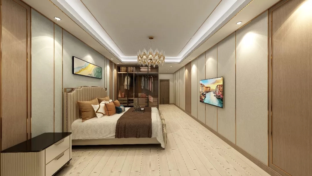 主卧充满温暖的气息,米黄色的墙板与深色环保衣柜,给简约的卧室增添了一些动感。