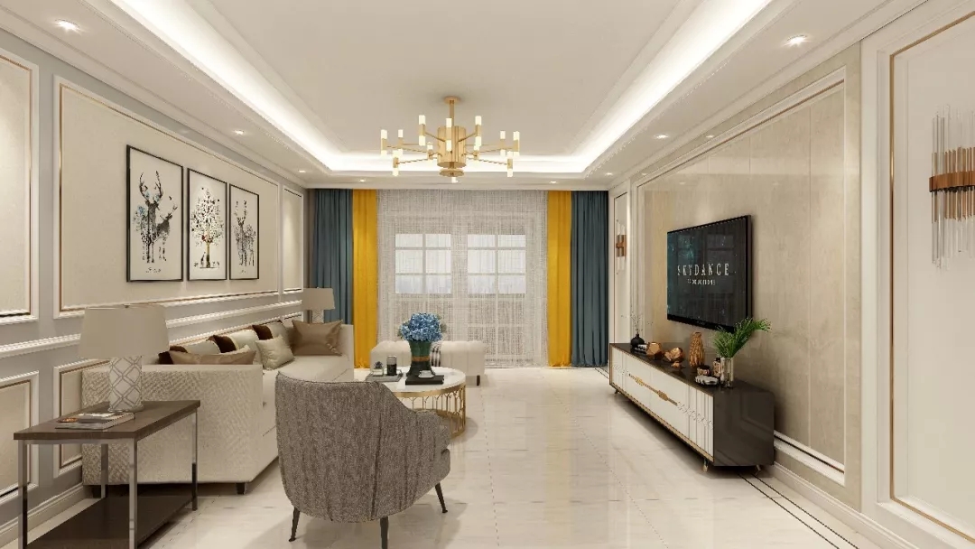 客厅没有过多复杂的造型,电视背景墙使用米黄色墙板,简洁大方。黄色系窗帘与整体色调搭配,明度更高,让人眼前一亮,这也是软装的常用手法之一。