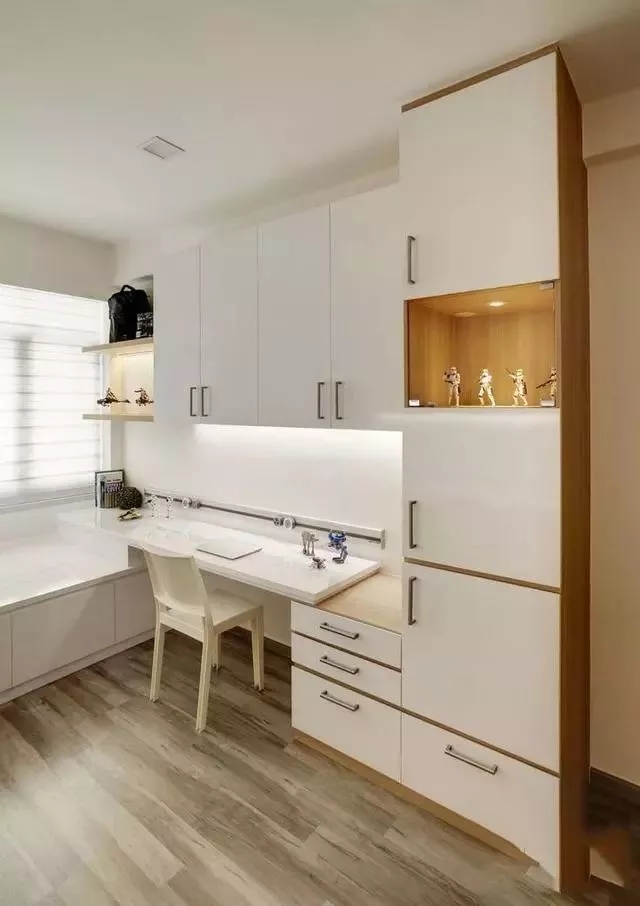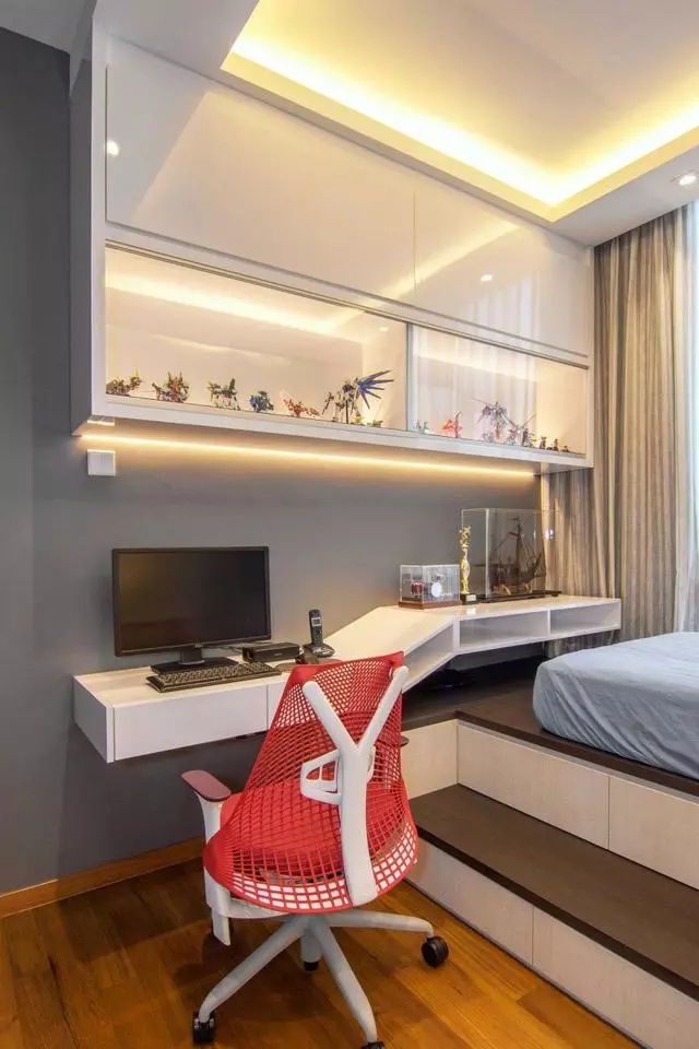 一个超级实用的榻榻米空间,可以结合靠墙而立的定制柜体,来提高整个房间的收纳机能,达到“一房多用”的目的。