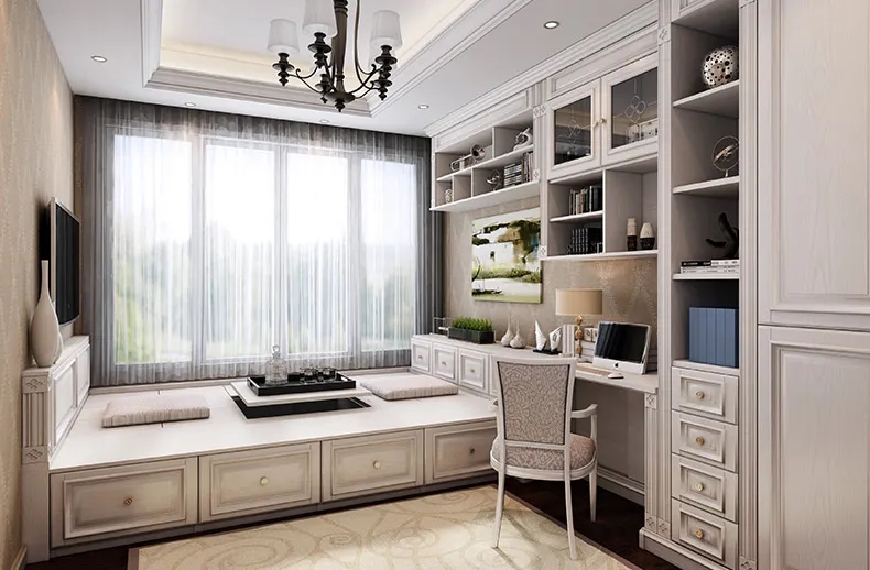 如果因户型面积受限,无法拥有一间独立书房的话,可以把榻榻米空间打造成一个小型书房,更能展现一分恬静的感觉。