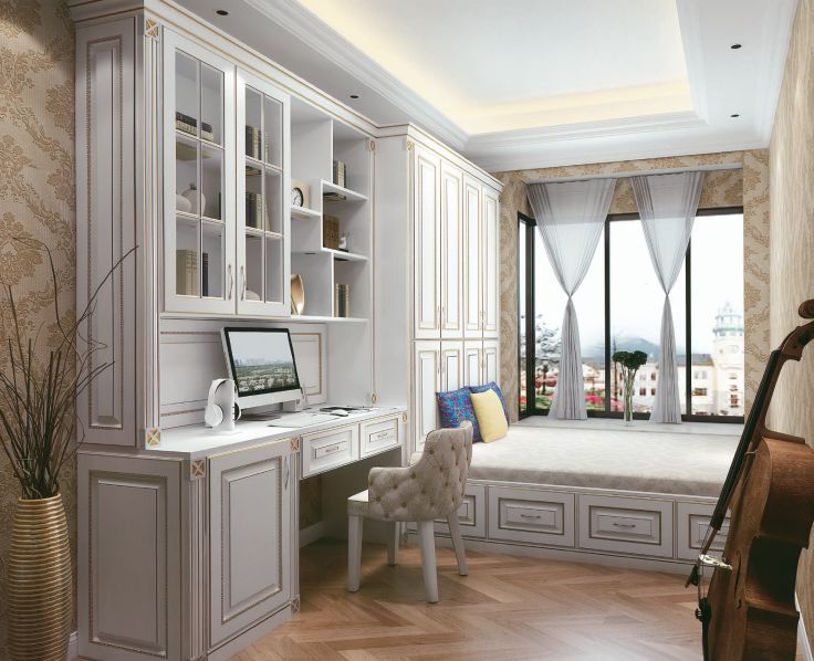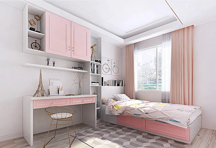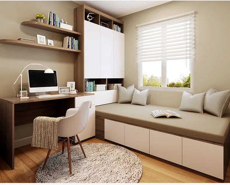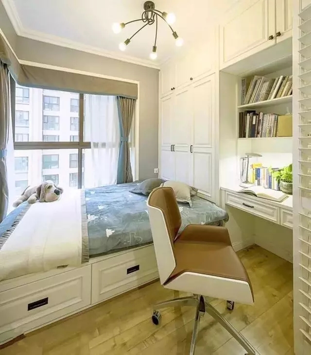 结合户型和采光来判断书桌的朝向以后,你就可以确定将组合式柜体放在床头还是床尾。L型的布局方式可以更好地完成衣物、书籍和零碎物品的收纳,还能提高整体空间的利用率,塑造简洁干净的空间感。