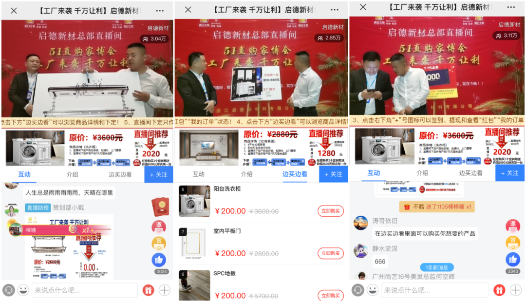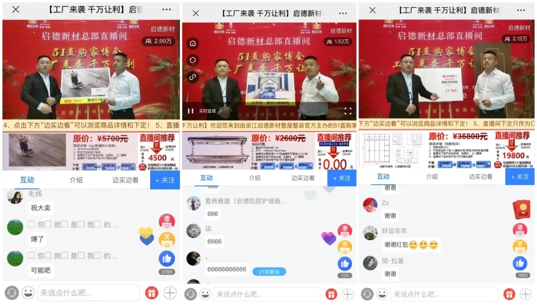 除了这些优惠外,直播间内价值2600元的智能晾衣架免费送、到店红包礼、9.9元抢购1000元代金劵、到店砸金蛋等不断出现,掀起一波又一波的“启德666”刷屏!以及海量红包雨不间断惊喜降临,大大刺激了潜在消费者的购买欲望,提高了直播间的活跃度和转化率,粉丝们争先抢货,一度点燃直播间火爆氛围。