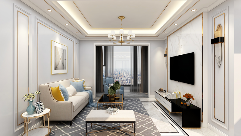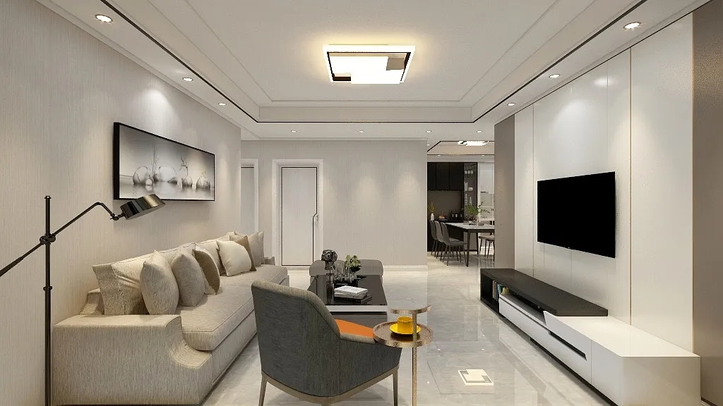 客厅以米白色系为基调,简约线条感的木饰面配以款式大方的家具,诠释出简洁、沉稳之感。