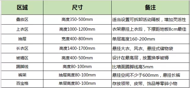 如果是定制衣柜的话,建议根据家人的不同身高和需求来定制,如果是买成品衣柜,尽量选择一个折中的尺寸,满足家里每个人的身高。此处奉献一个衣柜的黄金尺寸表: