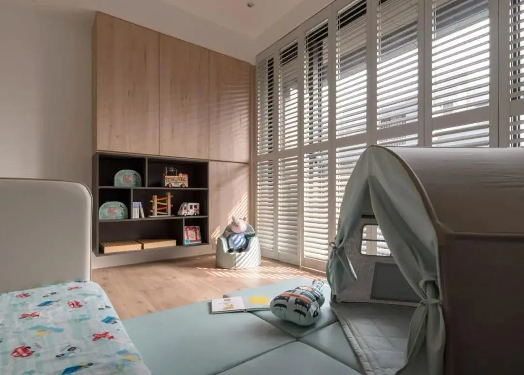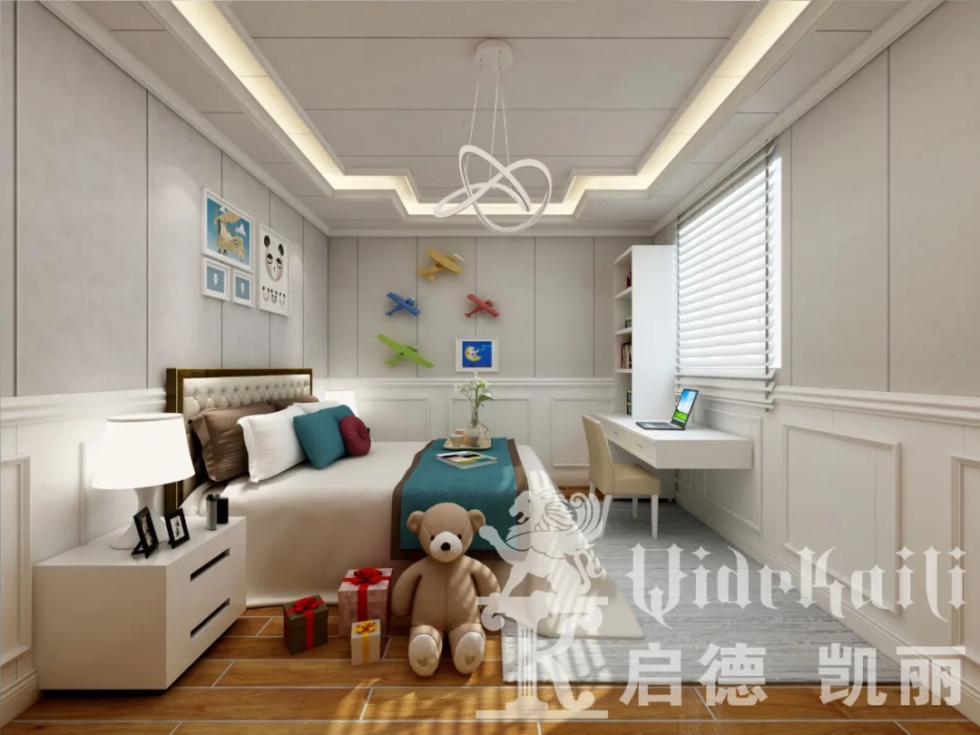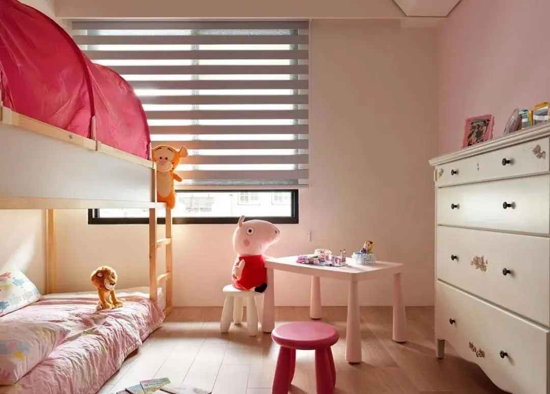 儿童房要有充足的照明,让房间内温暖明亮,这样才会让孩子更有安全感,房间内最好选择可调光的灯具。
