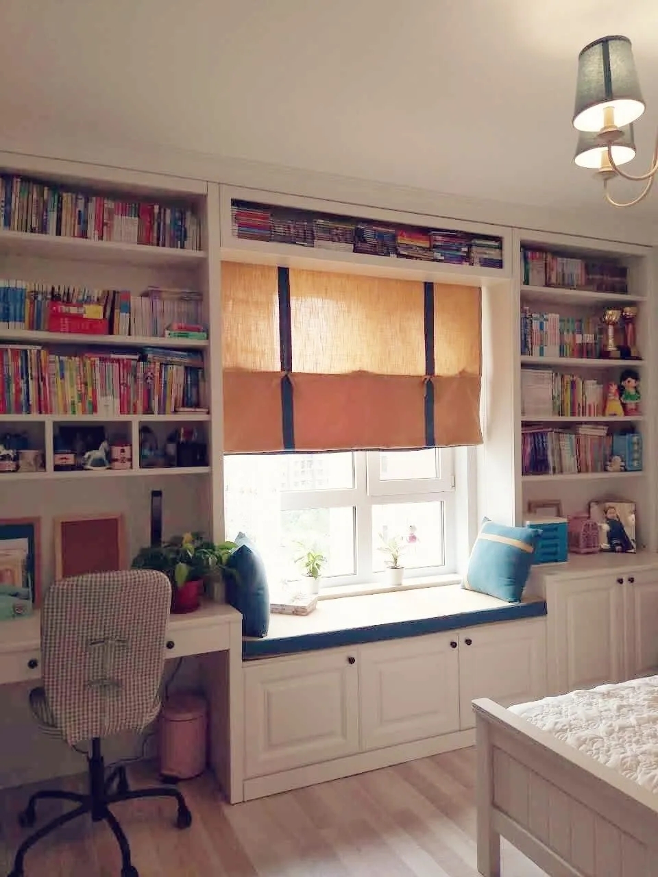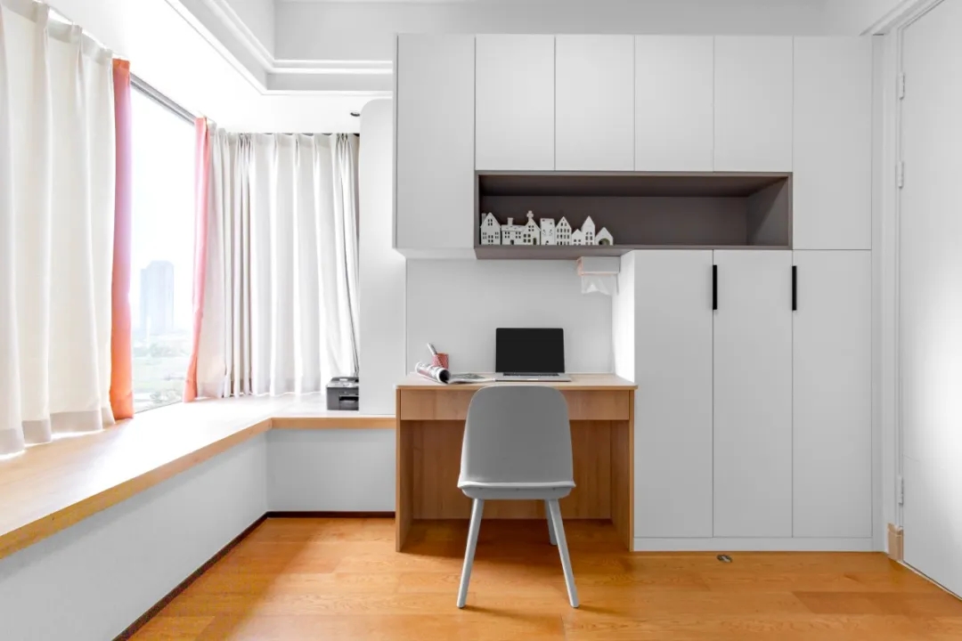 ▲飘窗与书桌L形组合,扩大书桌台面空间。