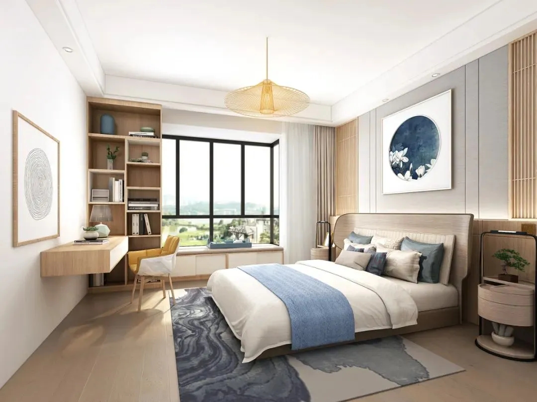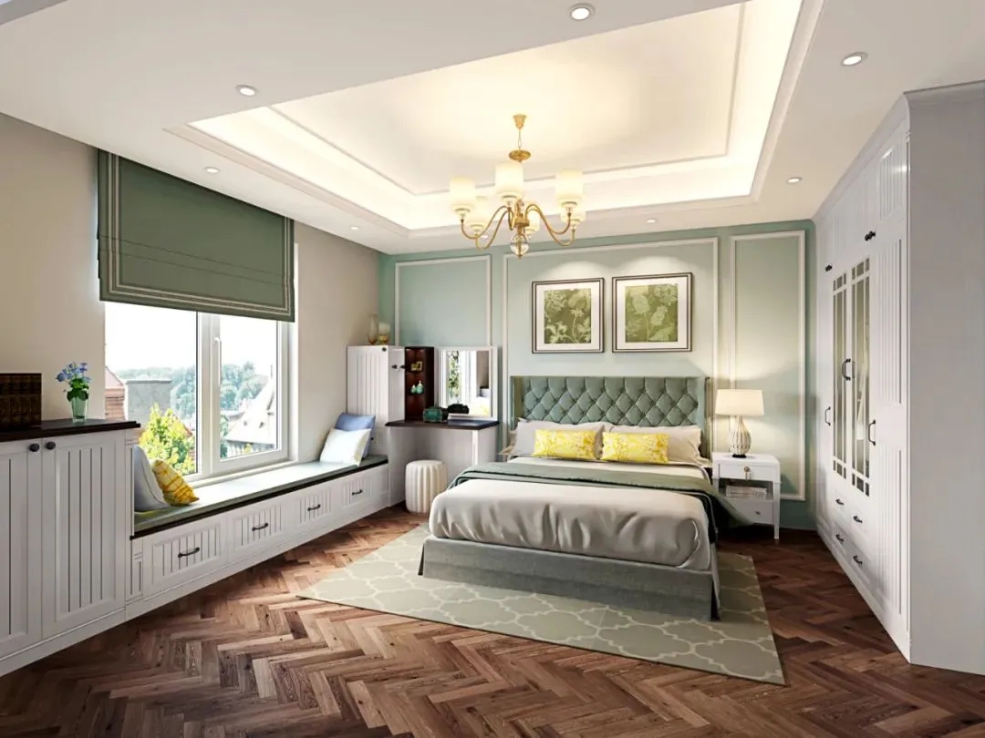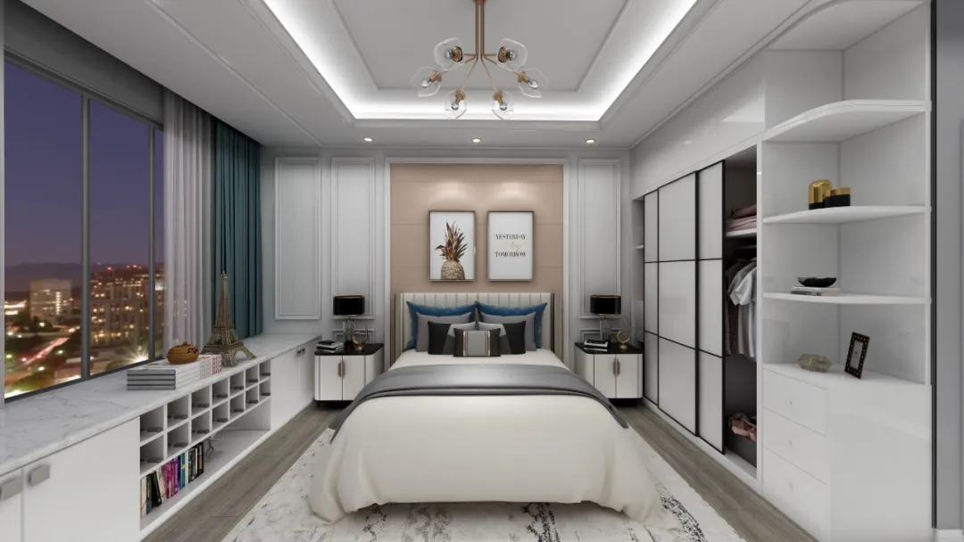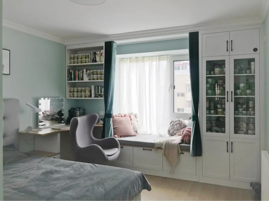 在没有飘窗的户型中,如果窗户旁边的空间又是比较宽裕的,就可以在靠窗位置装上一排的飘窗,然后把飘窗两侧的空间也做成收纳柜利用起来。这样靠窗也能安装定制柜,还不会让柜子遮挡窗户、影响空间的采光与通风。