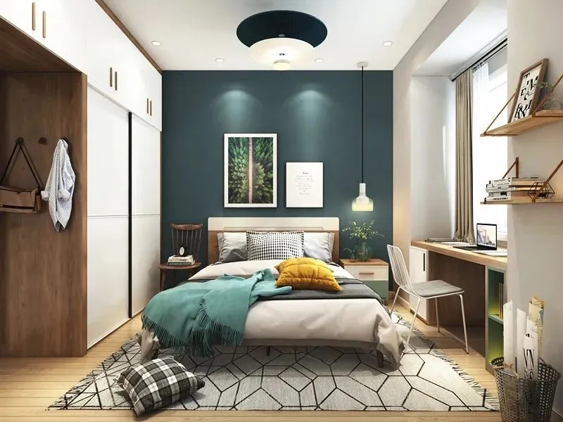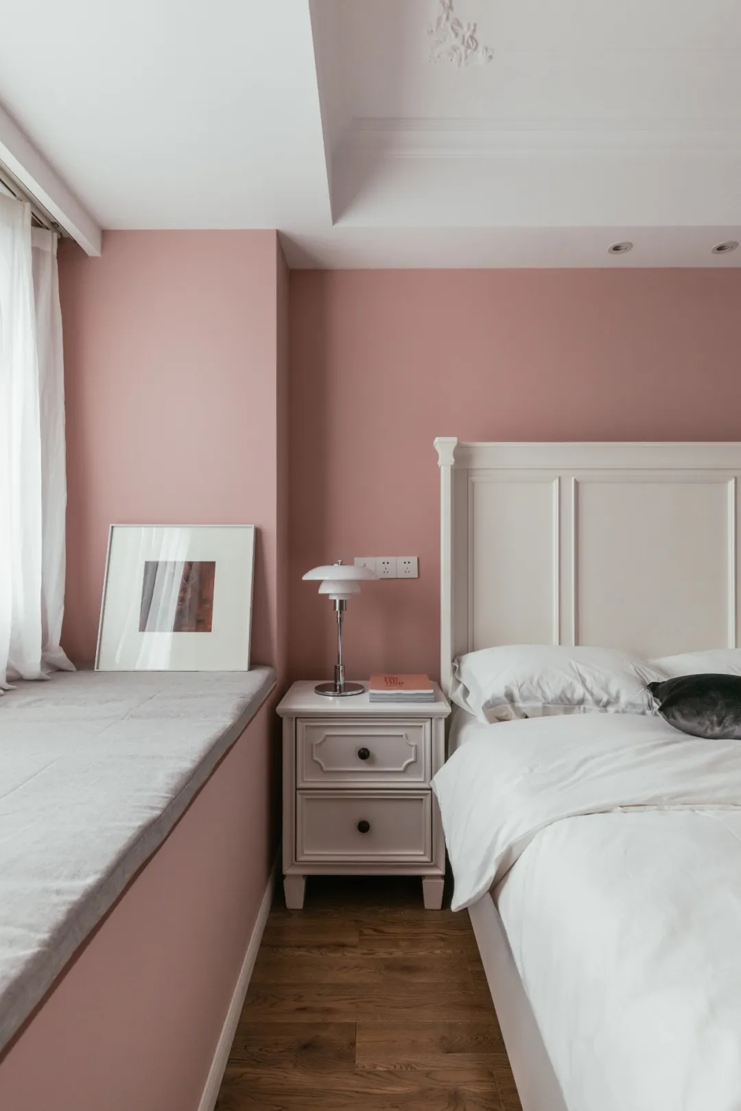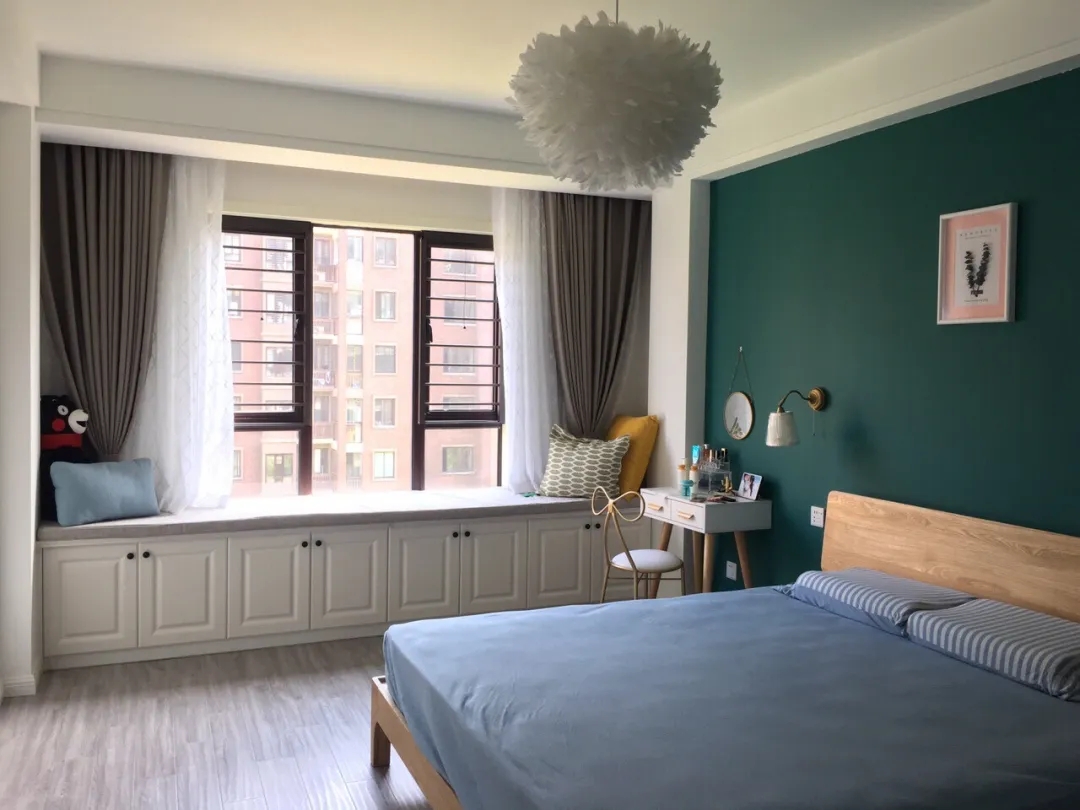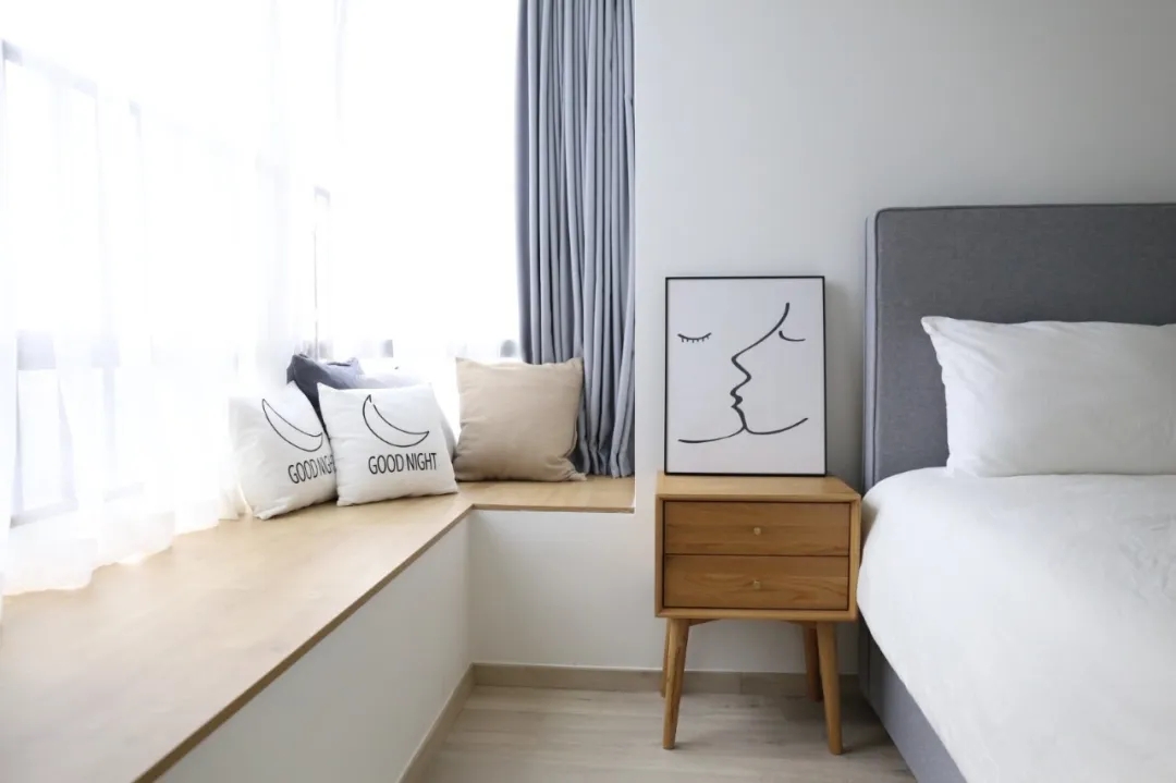 户型的窗户外凸,窗户与两侧的墙体有个凹位,这样就可以平着窗户两侧的墙体,装上一个飘窗收纳柜,让空间的每一个角落都得到到位的利用,为小户型提供更加充裕的储物收纳空间。