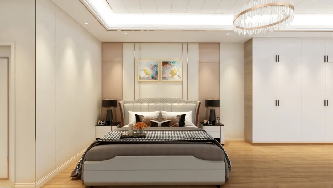卧室进门处定制整面墙衣柜(顶天立地式),与室内装修主色调相一致,中间做空10公分,将衣柜划分为吊柜和地柜,有利于更好地收纳。