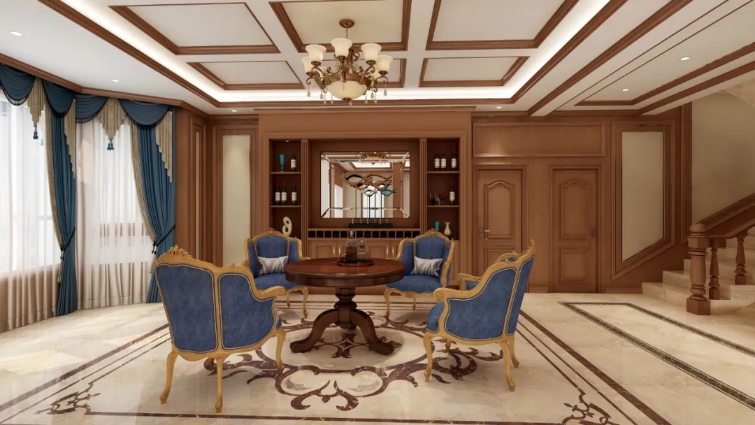 当空间足够大时,建议做顶天立地式餐边柜,中间依旧采用镂空设计,随意收纳点东西,柜子下半部分增加抽屉的数量,不方便摆在明面上的物品,就藏到抽屉里。