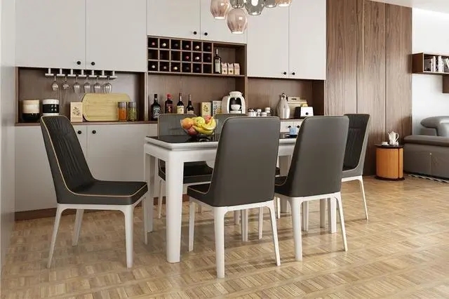 如果餐厅面积不足,那便采用餐边柜+卡座设计,将卡座嵌在柜子中,底部加装抽屉用来收纳,颜值与实用性能够同时兼顾。