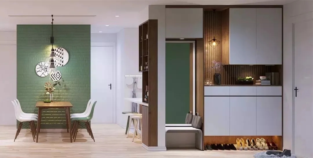 我们可以在玄关处做一个到顶的鞋柜,样式根据自己的喜好来选择,中间采取镂空设计,用来放钥匙、背包、帽子等小物品,底部留出一个卡座,方便家里老人坐着换鞋。