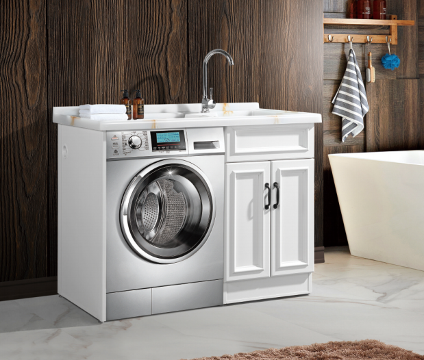 想把洗衣机放在卫生间,又找不到闲置的地方,不妨把浴室柜下方做成镂空设计,内嵌滚筒洗衣机,谁用都方便。