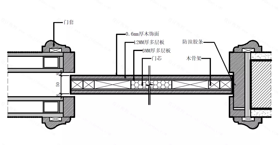 2)推拉式隐形门:常用在厨房门洞过窄的情况。节点图示意如下。如果厨房是双推门两侧都可以做成如下图结构。平时不用的时候推