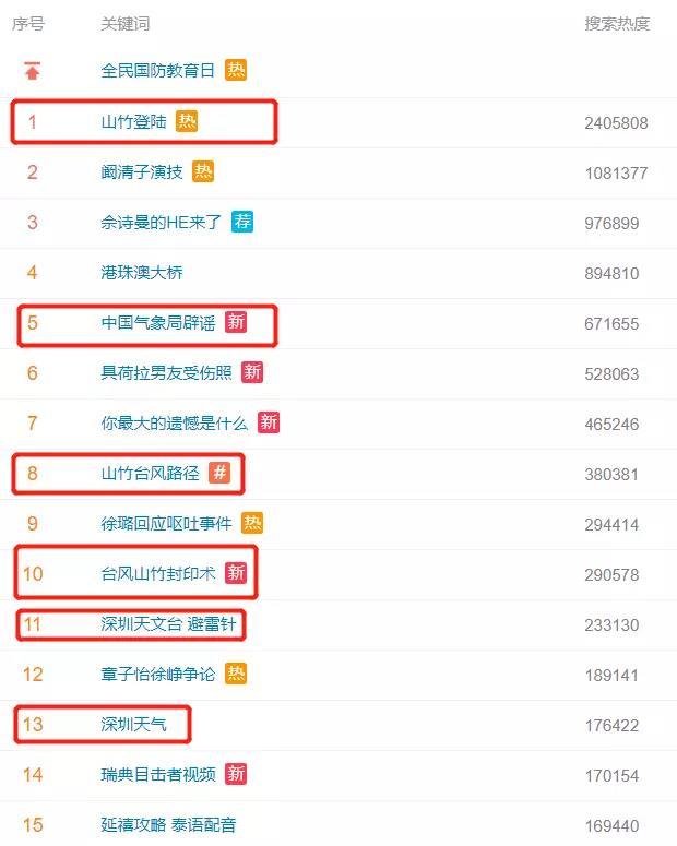 微博热搜前50条数了一下,有 13 条都跟“山竹”有关。